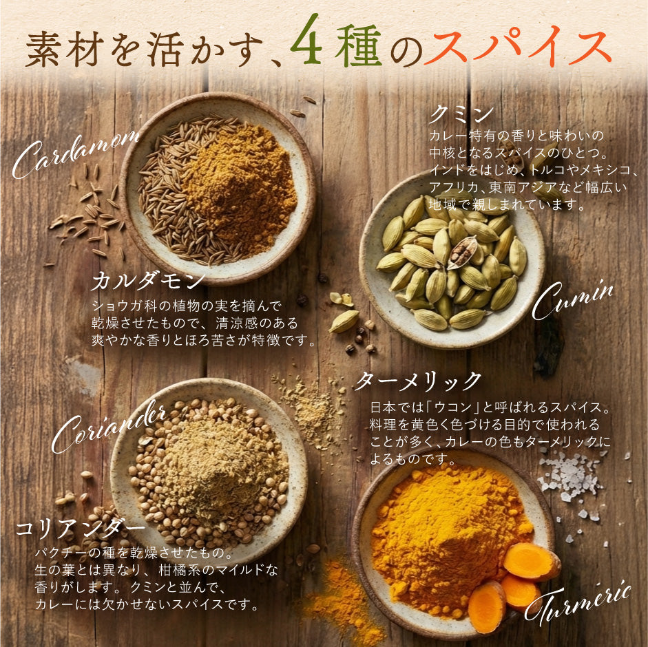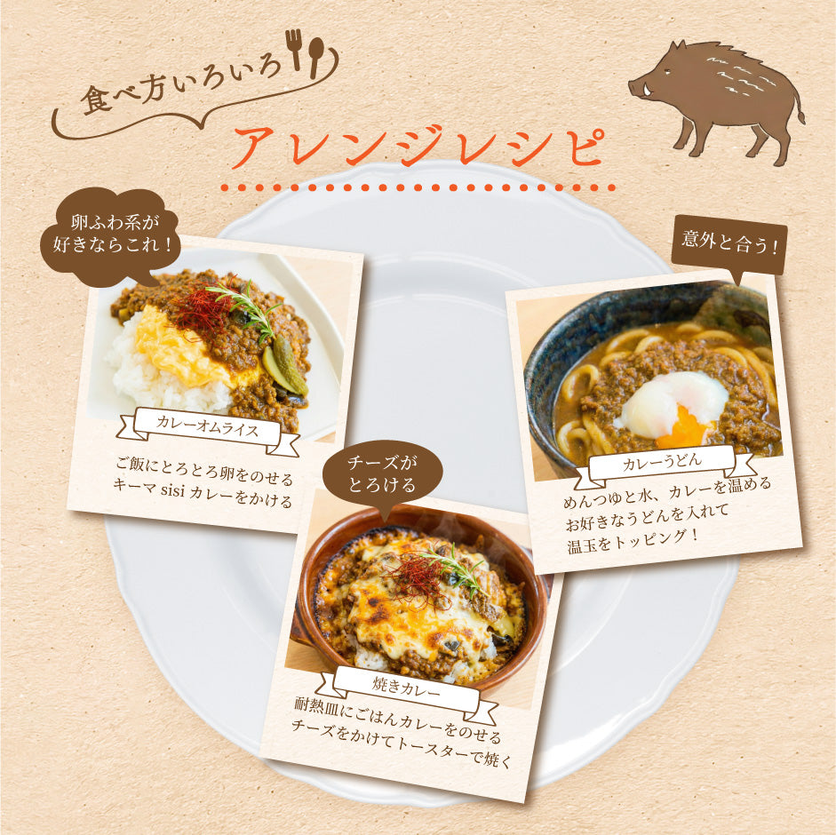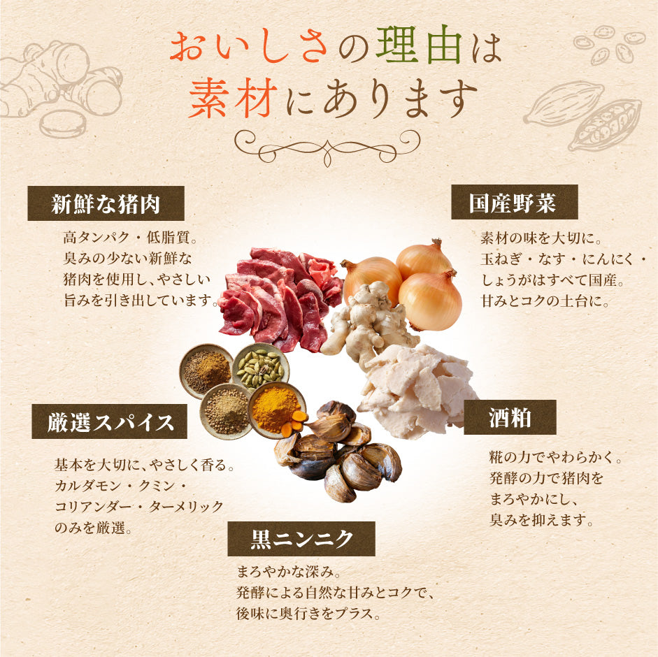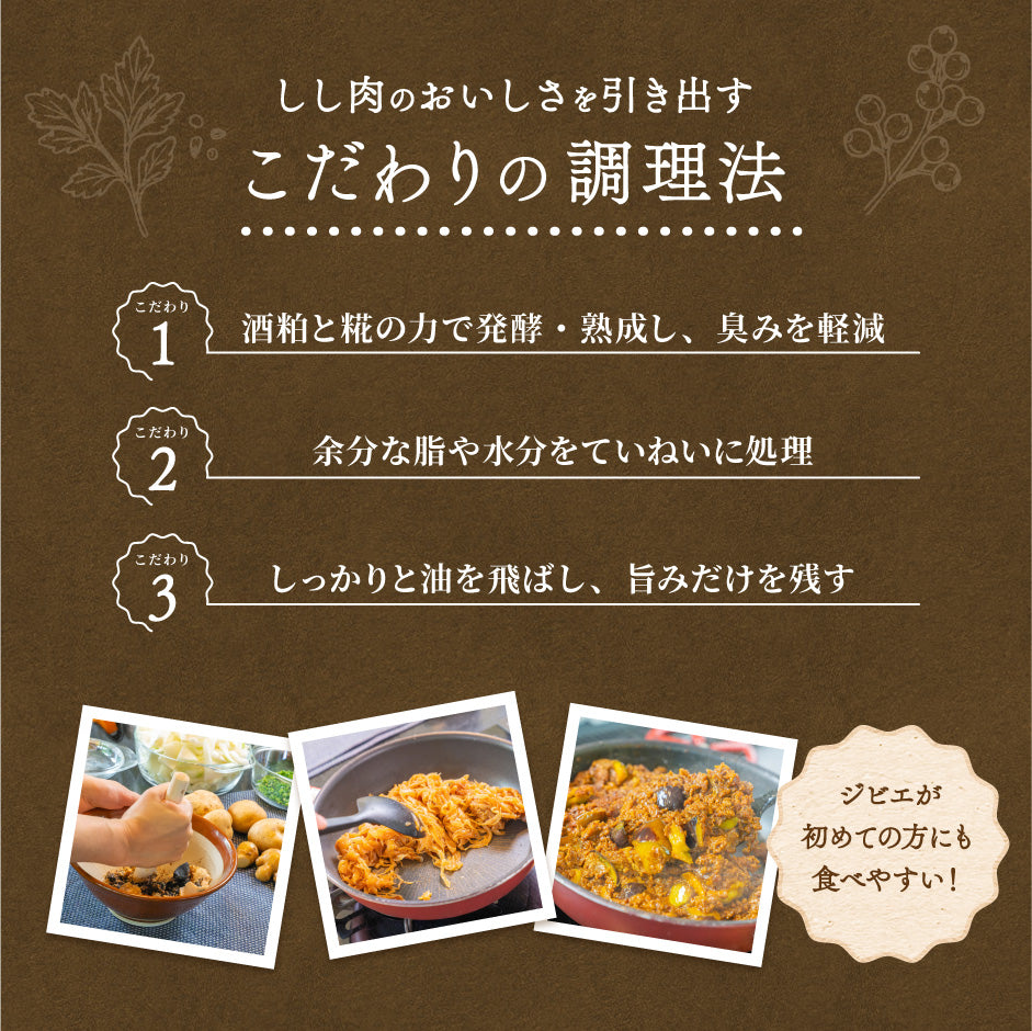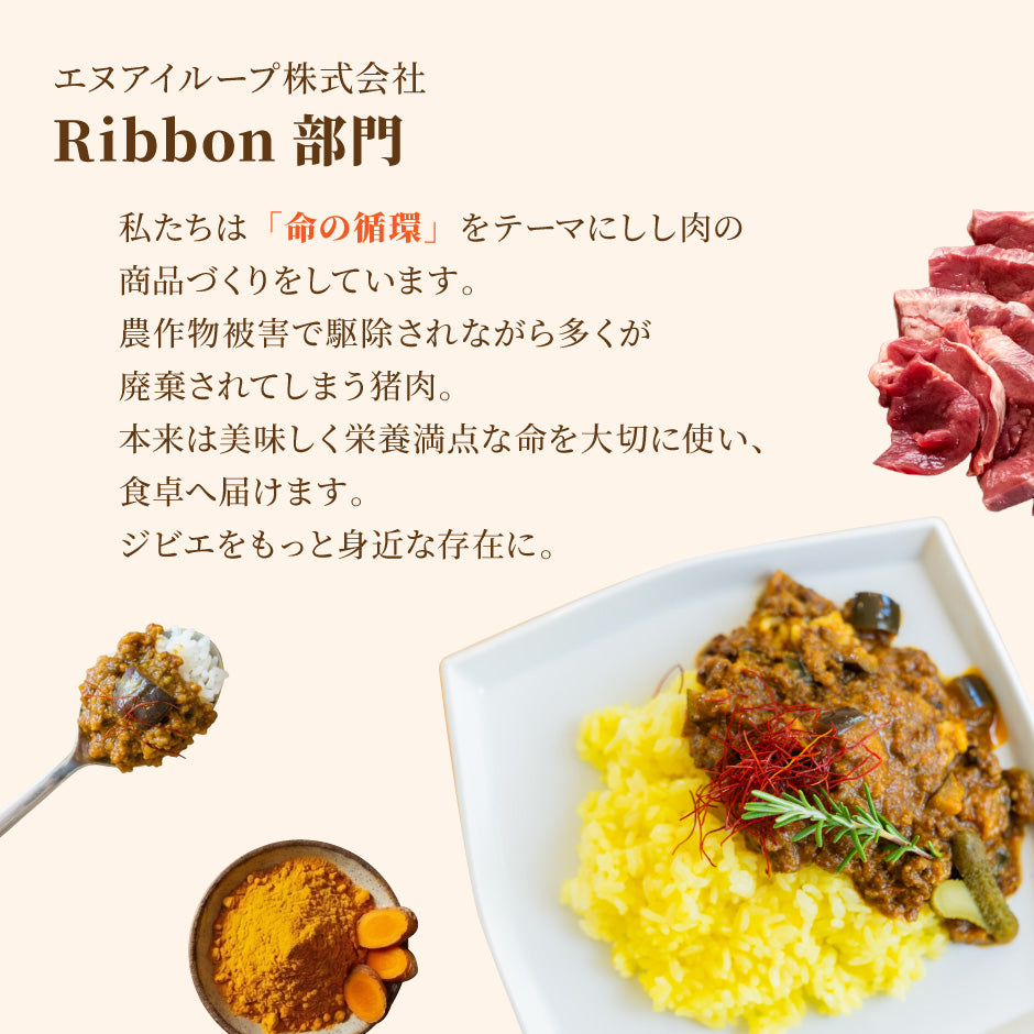 ふんだんにスパイスを使用していますが、子どもでも抵抗なく 食べることのできる辛さに調整しています。 ボイルするだけで本格的なしし肉カレーが簡単に味わえます。