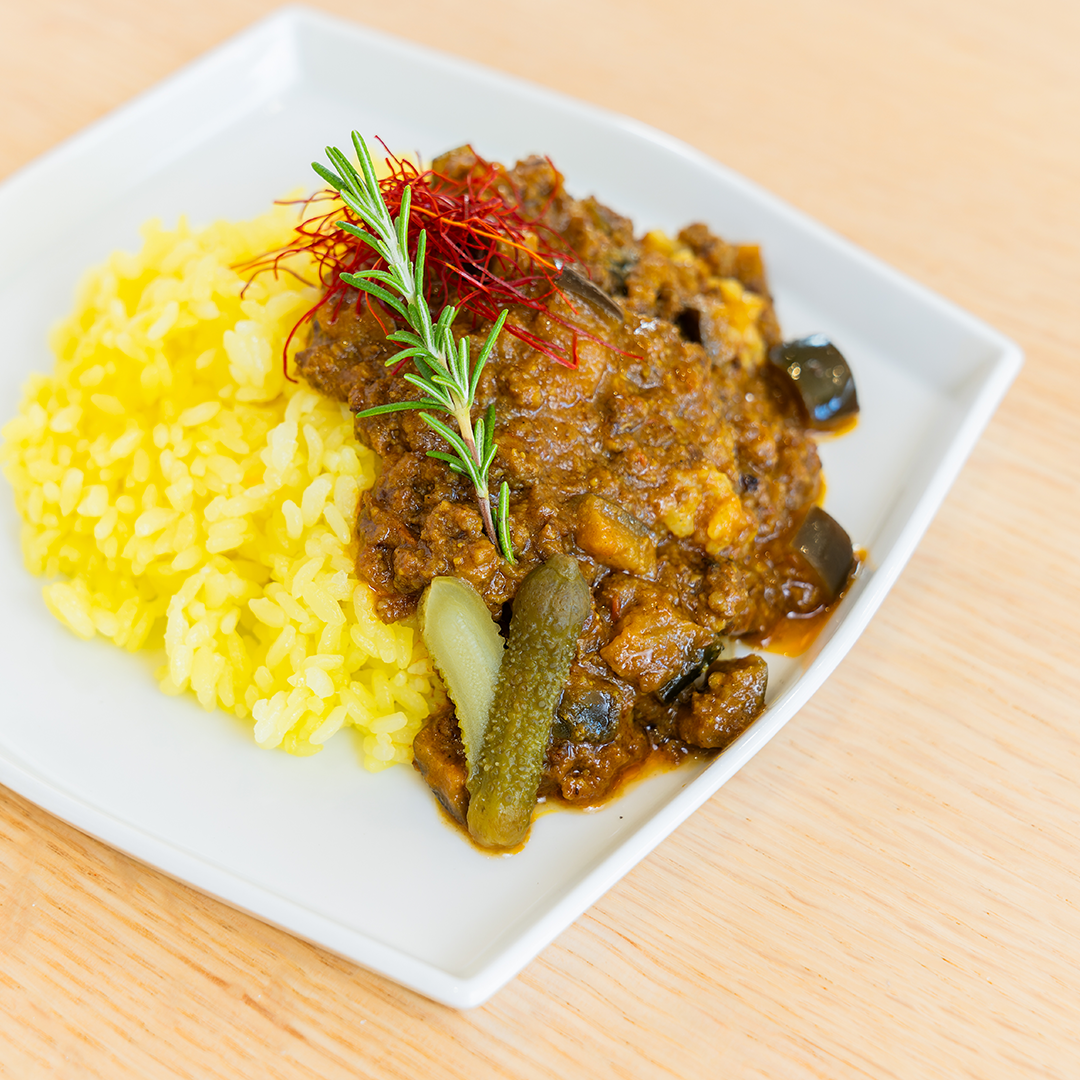 ルーは小麦粉不使用、玉ねぎをじっくり炒めて作ったカレーです。 使用する野菜は全て国産に拘り、黒ニンニク・酒粕を加え、深いコクと香りを引き出しています。