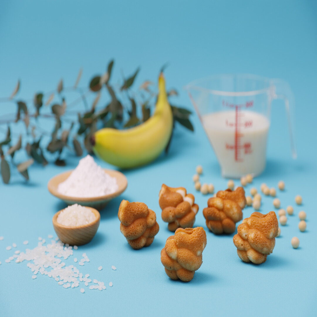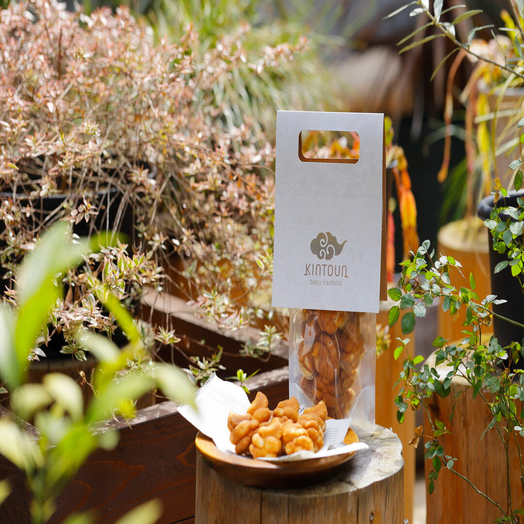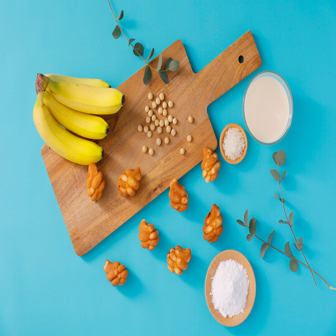 卵・牛乳不使用! バナナの自然な甘さと香りが広がる、米粉で作られた一口サイズのヴィーガンカステラです。