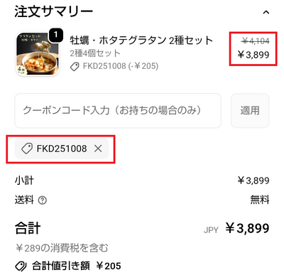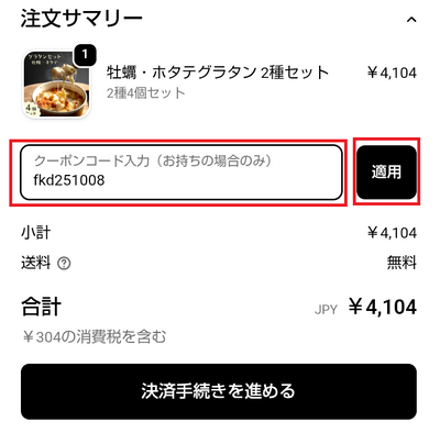 ②クーポンコード入力枠が表示されるので、「fkd251008」と入力し、適用ボタンを押します